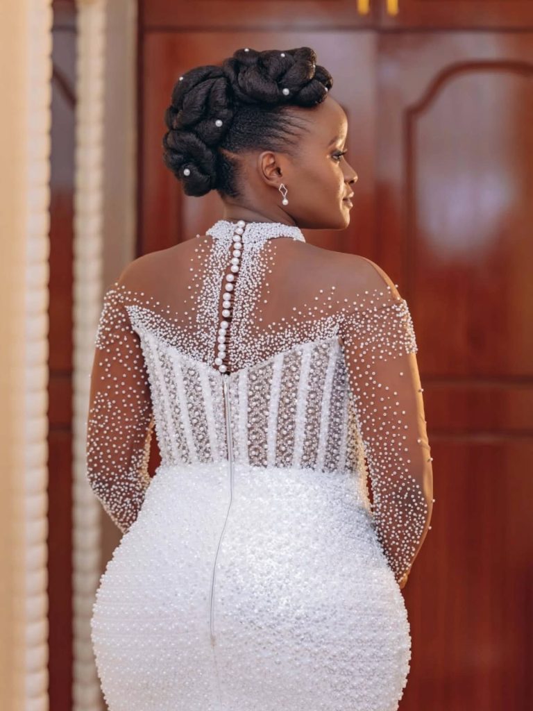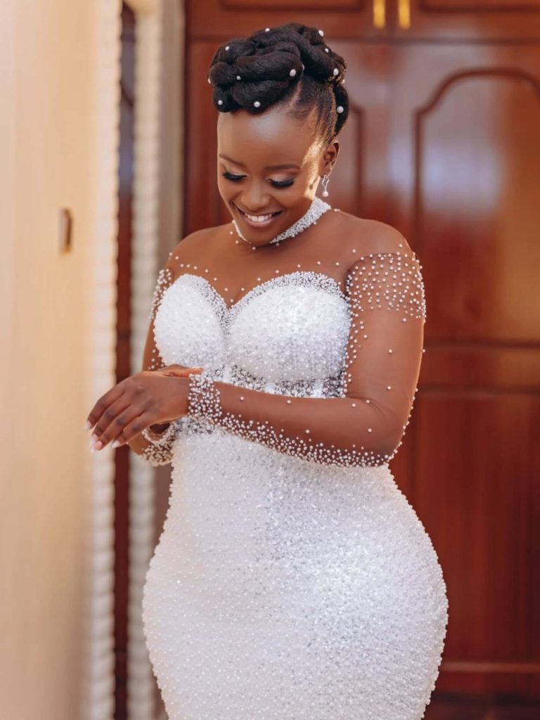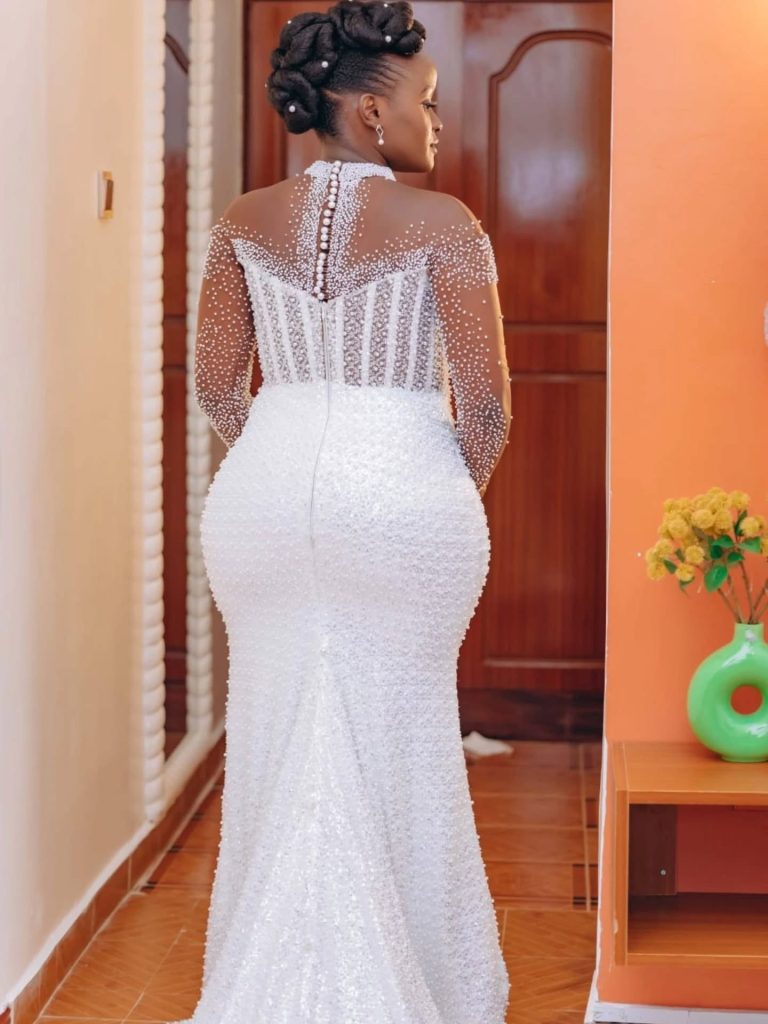 A stunning full lace custom made mermaid wedding dress with long sleeves in illusion lace, paired with a plain cathedral veil.