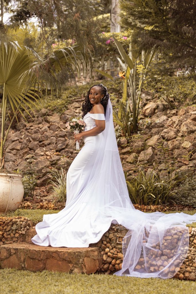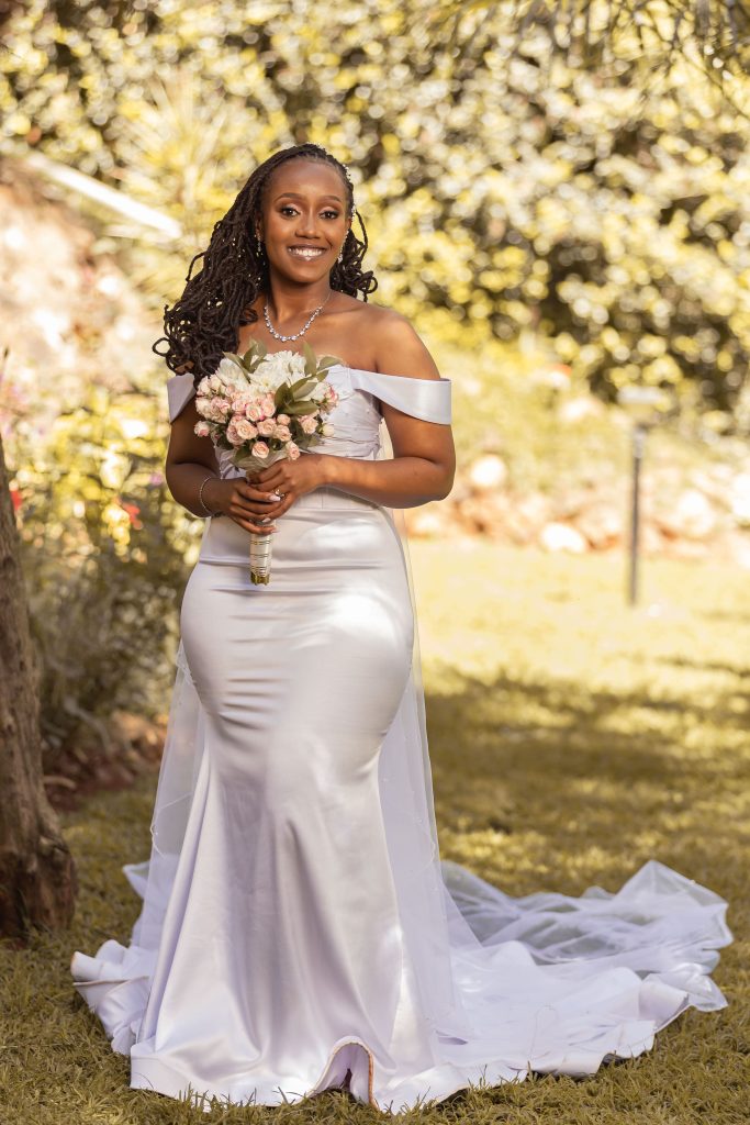 A sleeveless custom made mermaid wedding dress made of of satin with pearls on the bodice paired with a cathedral veil with pearls.