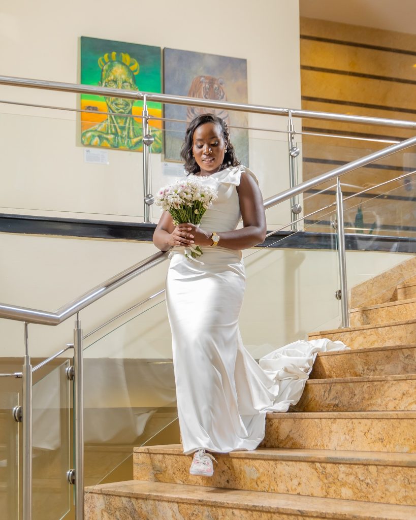 A sleeveless custom made mermaid wedding dress made of of satin with ruching on the bodice paired with a cathedral veil with pearls.